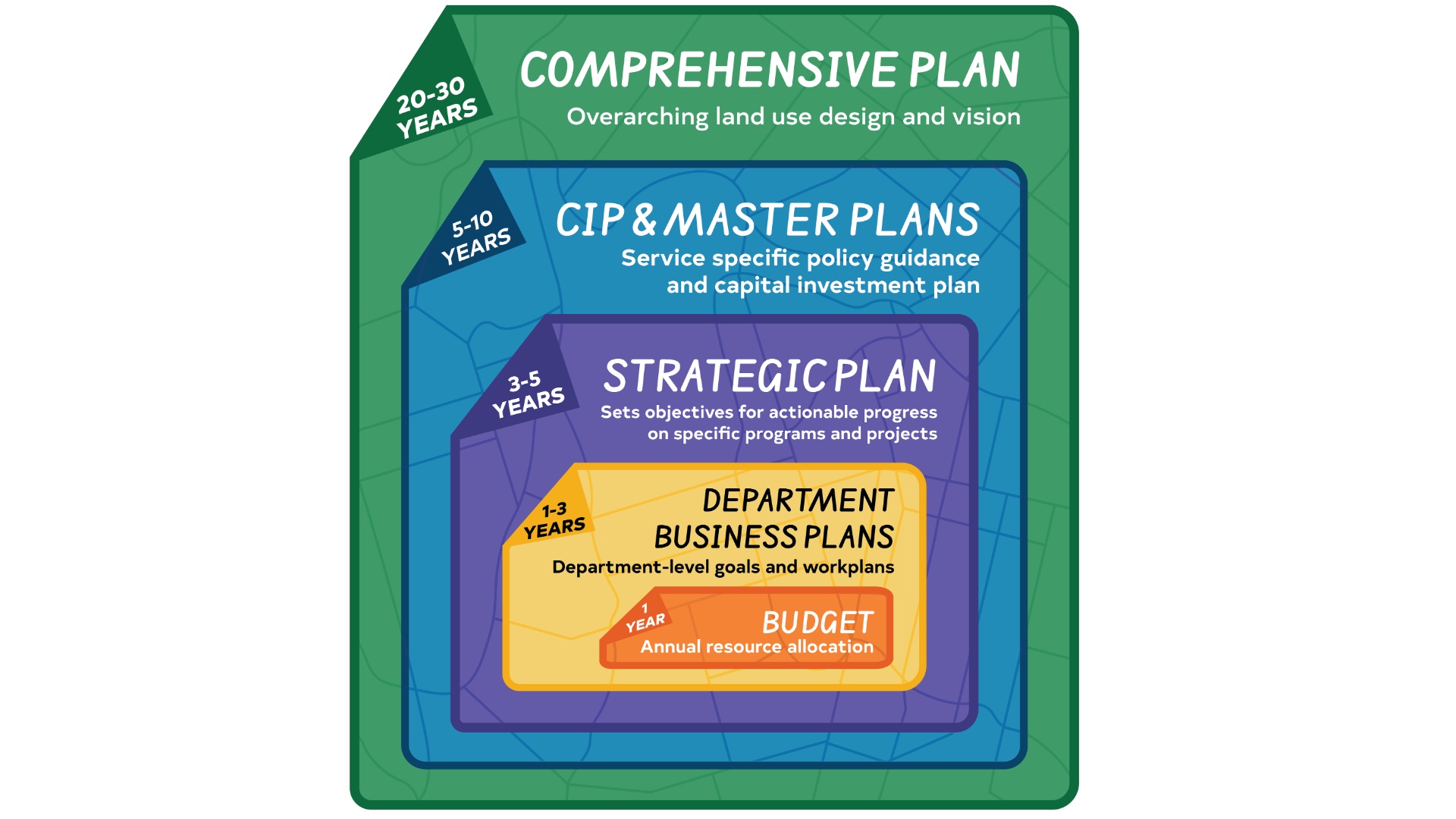 On this page, you’ll see how each plan – from the Comprehensive Plan to the annual budget – fits together to turn big ideas into real results. Explore the sections below to learn how Raleigh’s plans are built together – and how you can follow the work every step of the way.