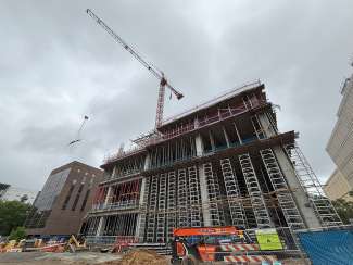 Work is progressing. The new building is now 29 percent complete. Not only are crews working on adding new floors, but the teams are also framing out the inside of the building.