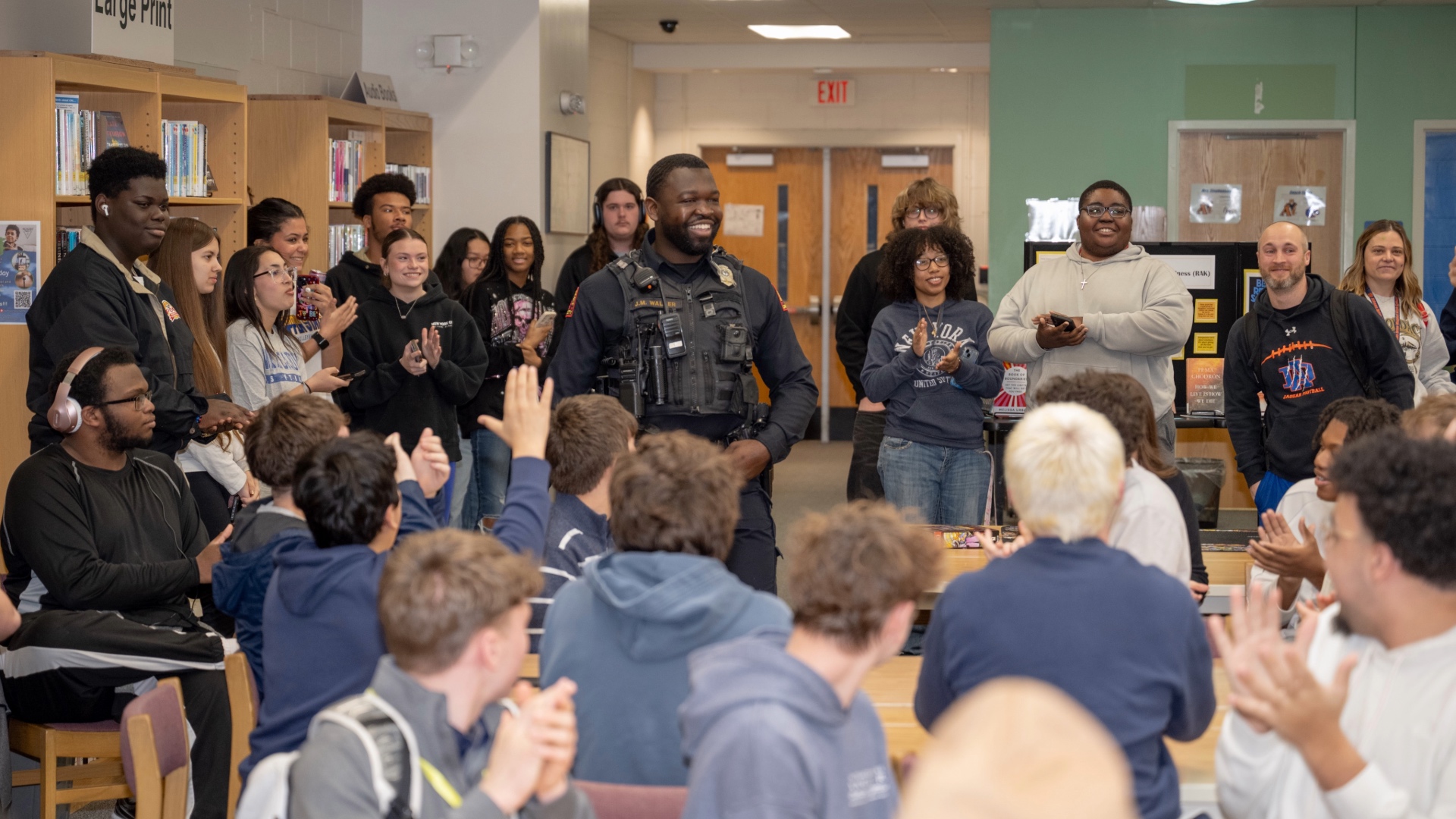 On February 11, school leaders, students, and RPD representatives gathered at the school’s main entrance for a special recognition ceremony honoring Officer Walker’s service and impact. The celebration, coordinated in partnership with Wake County Public School System Communications, took place just before the school’s lunch period – a fitting time to recognize the officer who spends his days building relationships in hallways, classrooms, and cafeterias.